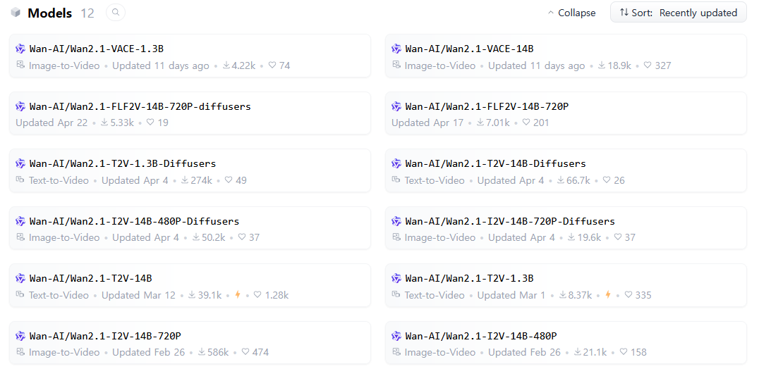 제가 wan을 가장 꼽는 이유는 간단합니다. 현재 wan 기반으로 파생된 모델 카드들이 가장 많기 때문입니다. 저는 주로 허깅페이스 트렌드에서 1~5페이지를 자주 둘러보는데, 비디오 관련모델(t2v, i2v) 중에서는 wan 기반 모델을 가장 자주 확인할 수 있었습니다.
