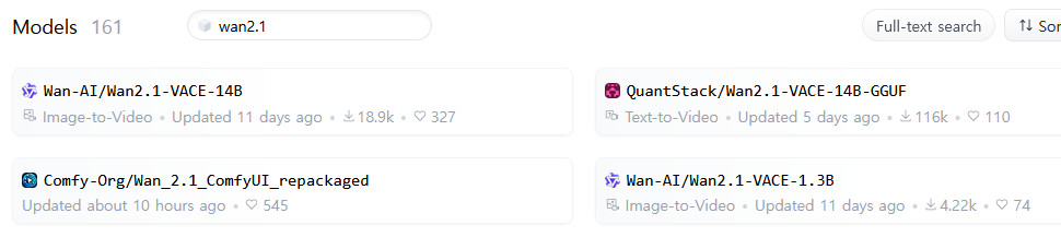 비디오 모델은 크게 2가지로 갈립니다. 텍스트를 기반으로 비디오를 만드는 t2v와 이미지를 기반으로 비디오를 만드는 i2v입니다. wan은 1.3B~14B 크기로 공유돼 있으며 T2V로 표시된 모델은 t2v, vace모델은 i2v로 분류돼 있습니다.