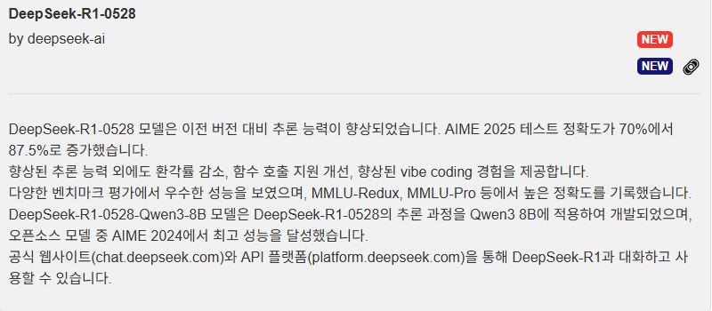 이번에 새로 출시된 R1-0528이 그만큼 언론의 주목을 받을지는 미지수지만 일단 오픈소스 중에서는 최상급의 성능을 가진 것으로 보이고 있습니다. 이번 발표에 오픈소스의 발전과 커뮤니티의 성장 등 다양한 평가가 나올 수 있지만 개인적으로는 특히 아직 오픈소스 릴레이가 끝나지 않았다는 것에 의의를 두고 있습니다. 적어도 당분간은 오픈소스LLM이 이어질 것이며, 더 가성비이면서 고성능 모델이 나올 수 있으리라 생각합니다. (모델 링크: https://huggingface.co/deepseek-ai/DeepSeek-R1-0528)