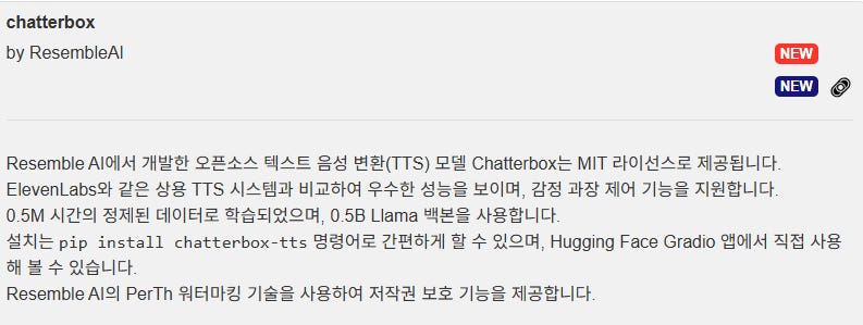 이번에 떠오르고 있는 chatterbox의 경우 MIT 라이선스로, 상업적 이용이 가능합니다. 또한 감정을 과장되게 표현하는 기능을 지원하는 최초의 오픈소스 TTS모델이라고 주장하고 있습니다. 다만 영어만 공식 지원하므로 한국어 등 다국어로 사용하셔야하는 분들께는 제한이 있을 수 있습니다.
